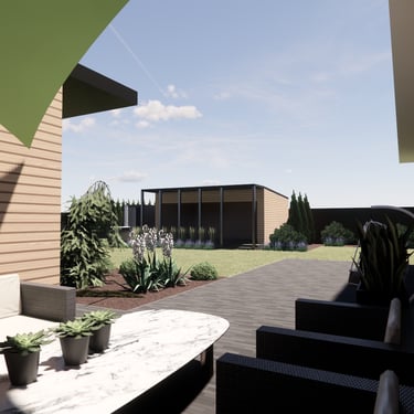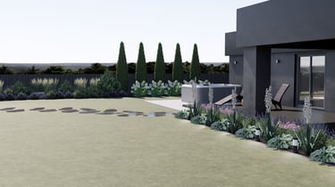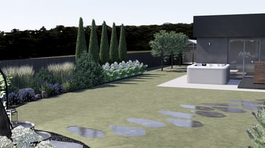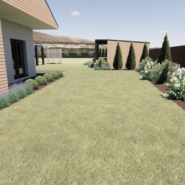 Projektas kuriamas aplink centrinę vejos plokštumą, kuri formuoja pagrindinę erdvės ašį ir suteikia sklypui proporcingumo bei aiškumo. Šoniniai augalų masyvai ir vertikalūs akcentai kuria struktūrinį rėmą, išlaikant vizualinę tvarką visoje teritorijoje.