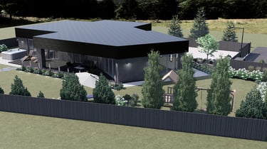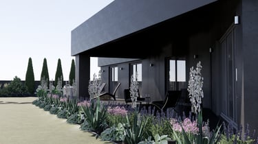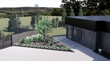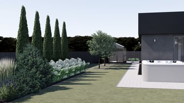Šiame projekte svarbiausia – aiški erdvinė struktūra ir proporcijų balansas tarp architektūros ir želdinių. Tamsi pastato estetika papildyta šviesiais hortenzijų masyvais, vertikaliomis spygliuočių linijomis ir apgalvotu takų ritmu.