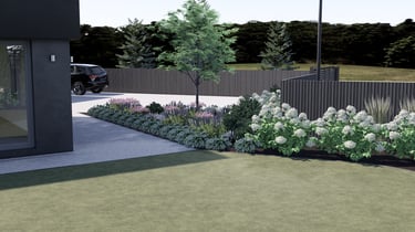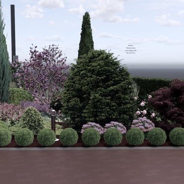 Šiame projekte dominuoja švelnios formos ir apvalių augalų ritmas, kuris kontrastuoja su aiškiomis architektūros linijomis. Kompozicija paremta struktūruotu krūmų masyvu ir hortenzijų žydėjimo dinamika, suteikiančia erdvei gyvumo, tačiau išlaikančia tvarką.